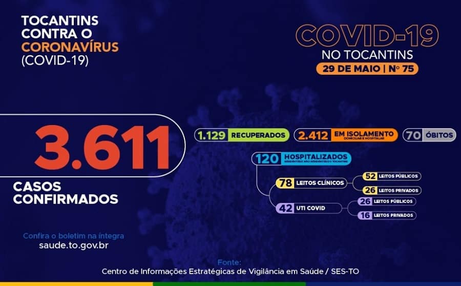 O total de curados é 1.129 pacientes, representando 31,2% do total. 70 pacientes foram a óbito. O índice de letalidade da doença no Tocantins sé de 1,9%.