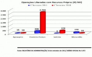 Segundo o relatório analisado pelo blog nesta segunda-feira, 17, de janeiro a junho foram autorizadas operações de crédito na ordem de R$ 1,4 milhão contra R$ 3,8 milhões liberados no mesmo período de 2010 – corte de R$ 2,4 milhões.