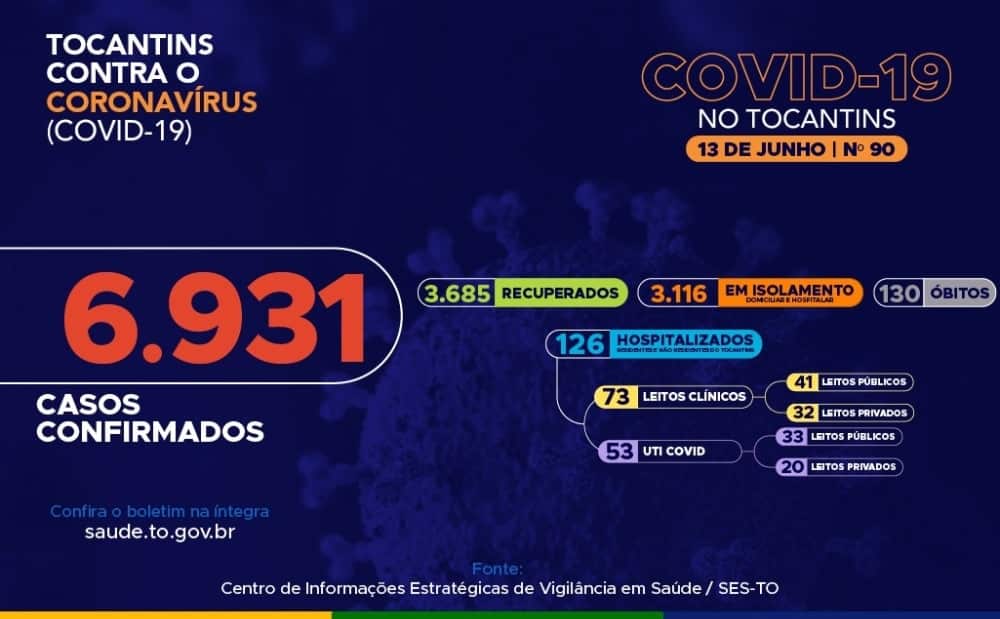 Desta forma, hoje o Tocantins contabiliza 6.931 casos confirmados da doença, destes 3.685 pacientes estão recuperados e 3.116 estão ainda em isolamento domiciliar ou hospitalar, além de 130 óbitos.