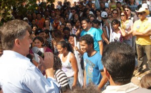 Antes da reunião, em palanque montado na área central do município de pouco mais de 4 mil habitantes, os candidatos fizeram rápida passeata pelas ruas principais do município.