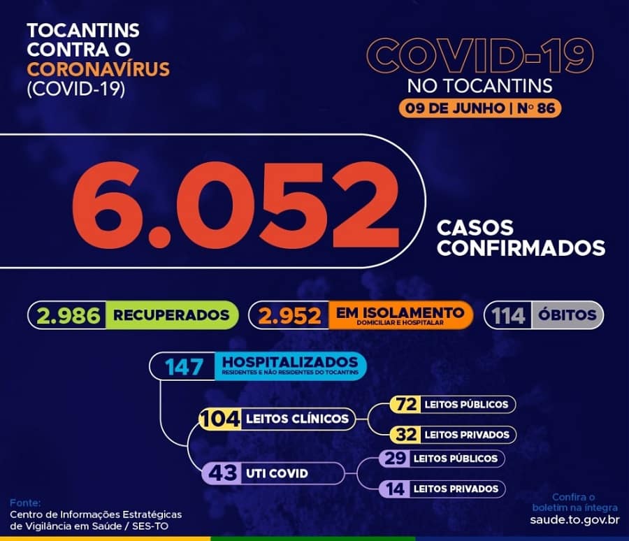 Desta forma, hoje o Tocantins contabiliza 6.052 casos confirmados da doença, destes, 2.986 pacientes estão recuperados e 2.952 estão ainda em isolamento domiciliar ou hospitalar, além de 114 óbitos.