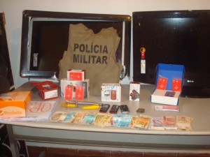 Durante a fuga os acusados lançaram para fora do veículo os produtos do furto, sendo parte deles recuperados pelos militares, que foram 01 aparelho de TV LCD 32 polegadas marca CCE (danificado), 01 aparelho de TV LCD 32 polegadas  marca Philips (danificado), 06 chips de celular 3G GSM Claro e 09 aparelhos celulares de diversas marcas e modelos.