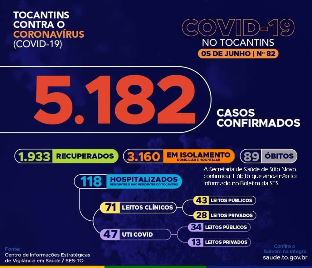 Desta forma, hoje o Tocantins contabiliza 5.182 casos confirmados da doença, destes, 1.933 pacientes estão recuperados e 3.160 estão ainda em isolamento domiciliar ou hospitalar, além de 89 óbitos.