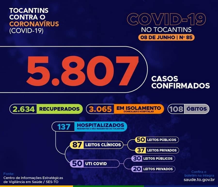 Segundo a Secretaria de Estado da Saúde (SES) o Tocantins contabiliza 5.807 casos confirmados da doença, destes, 2.634 pacientes estão recuperados e 3.065 estão ainda em isolamento domiciliar ou hospitalar, além de 108 óbitos.