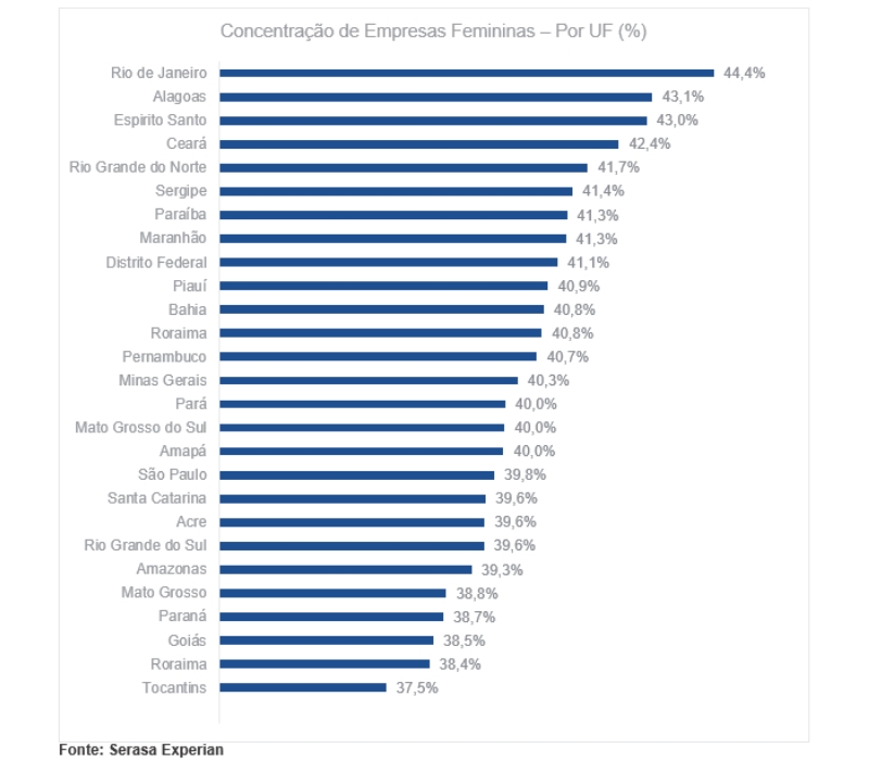 Um estudo inédito da Serasa Experian mostrou que das 20,6 milhões de empresas ativas no Brasil, 8,4 milhões, o equivalente 40,5%, têm mulheres como donas ou sócias majoritárias. No recorte por unidades federativas (UFs), os dados indicam que 37,5% das companhias no Tocantins são lideradas por mulheres. Confira no gráfico a seguir o levantamento completo: