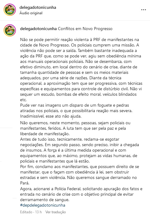 O deputado estadual, Toni Cunha (PSC), que é delegado licenciado da Polícia Federal e um dos bolsonaristas mais entusiasmados do Pará, condenou o ataque aos policiais, porém, ponderou sobre a forma da ação da PRF.