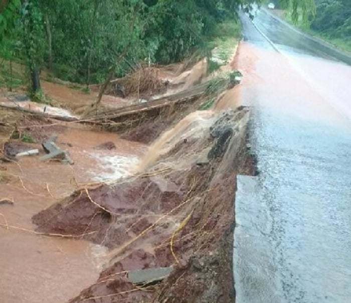 Segundo a PRF, o córrego Grota Seca transbordou e danificou parte do aterro do acostamento da rodovia. Se a chuva continuar o trânsito pode ser interrompido novamente e há o risco de desmoronamento porque a galeria de água não está comportando o volume de água.