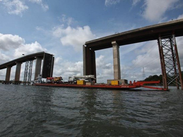 Uma balsa, dois rebocadores e uma lancha trabalham no processo de reconstrução da via danificada. Com a ajuda de um rompedor hidráulico, equipamento semelhante a uma britadeira, usado para demolir os destroços submersos, os operários retiram os blocos de concreto de dentro d’água e encaminham o material para outra balsa.