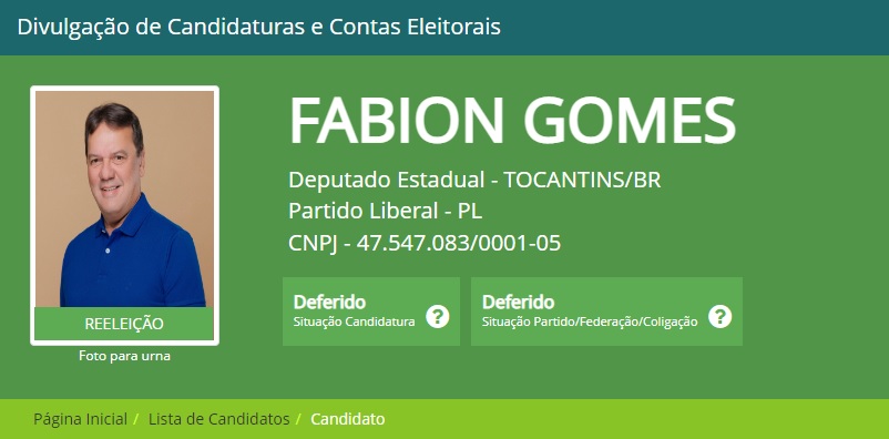 Após manifestação favorável da Procuradoria Regional Eleitoral, o TRE-TO (Tribunal Regional Eleitoral) aprovou, na tarde desta quarta-feira, 31, o registro de candidatura do deputado Fabion Gomes, para disputar a reeleição ao cargo de deputado estadual, nas Eleições Gerais 2022, pelo Partido Liberal (PL).