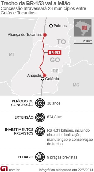 O projeto original da BR-153 previa a concessão de um trecho maior, entre Anápolis (GO) e Palmas (TO). Para permitir a redução no valor do pedágio e atender ao interesse dos investidores, o governo decidiu reduzi-lo. O pedaço da rodovia que foi retirado do programa deverá ser duplicado pelo próprio Ministério dos Transportes.