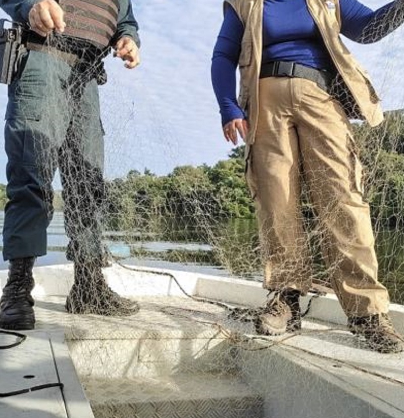 Solange Chaves, da Diretoria de Fiscalização da Semas, explica que os amarradores flagrados em atividade ilegal são práticas proibidas e ainda agravada com a utilização de malha de 7 cm de distância entre os nós opostos da rede, também proibida no Lago de Tucuruí. “Uso do amarrador e tamanho mínimo de malha não permitida no Lago. Neste caso temos tanto apetrecho proibido quanto o método de pesca também proibido, de arrasto e cerco, que chamam de amarrador, porque deixam a rede amarrada nas árvores”, descreve.