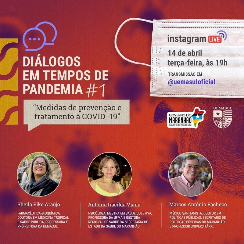 Com o tema Medidas de prevenção e tratamento à Covid-19, a primeira live terá como convidados Dr. Marcos Pacheco, secretário de Políticas Públicas do Maranhão, médico sanitarista, professor universitário, bacharel em Direito, mestre e doutor em Políticas Públicas e membro do Comitê Científico do Nordeste e Me. Antonia Iracilda Viana – Psicóloga, mestra em Saúde Coletiva pela UFMA, gestora regional de Saúde da secretaria de Estado da Saúde do Maranhão.