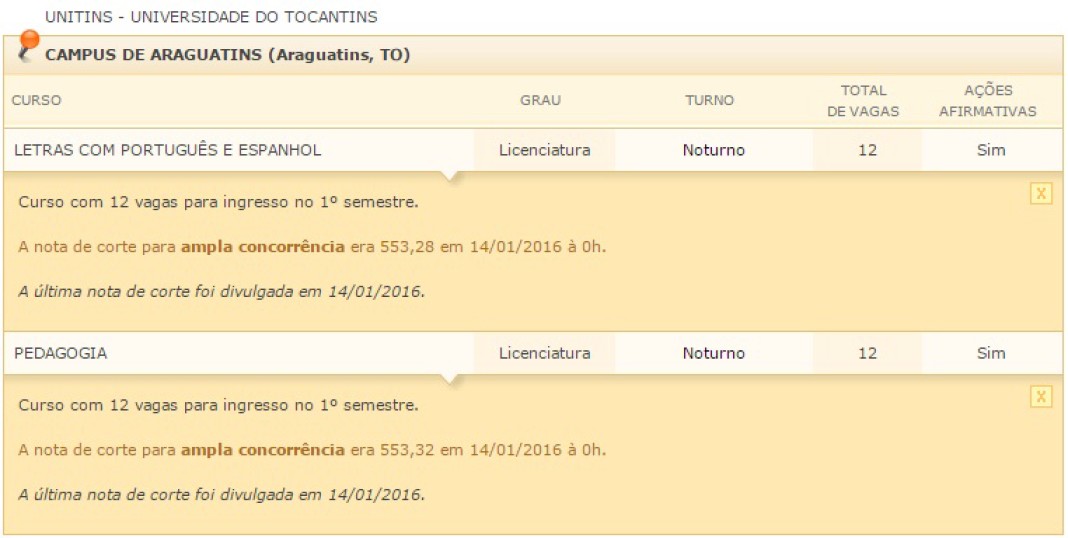 Vejas as notas de corte na UFT, IFTO e Unitins para o Bico do Papagaio: