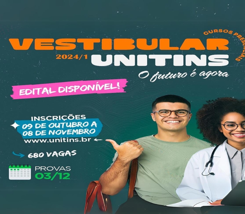 A Universidade Estadual do Tocantins (Unitins) publicou nesta quarta-feira, 4, o Edital do Vestibular 2024/1 com 680 vagas divididas entre os 17 cursos de graduação presenciais ofertados pela Instituição em seus cinco câmpus, sendo 40 vagas para cada curso. As inscrições estarão abertas no período de 9 de outubro a 8 de novembro e a taxa custa R$ 120,00. O edital e cronograma completos podem ser acessados AQUI.