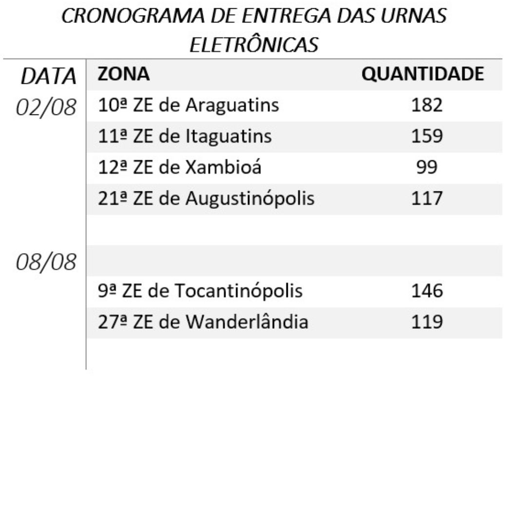 Quatro caminhões serão utilizados para o transporte dos equipamentos, com a definição de rotas específicas para cada veículo. A previsão é que a entrega das urnas às zonas eleitorais seja finalizada ainda na primeira quinzena de agosto.