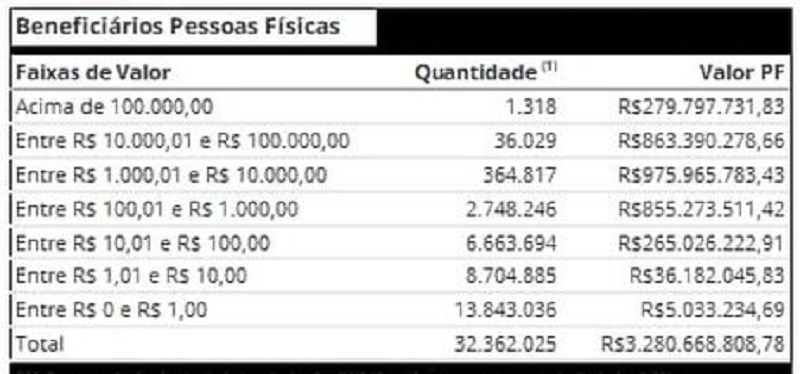 Como há casos em que um mesmo CPF tem mais de um valor a receber, foram realizadas 32,4 milhões de transações. Desse total, as transações de até R$ 1 representaram 13,8 milhões das liberações. Os valores entre R$ 1 e R$ 10 corresponderam a 8,7 milhões de casos.