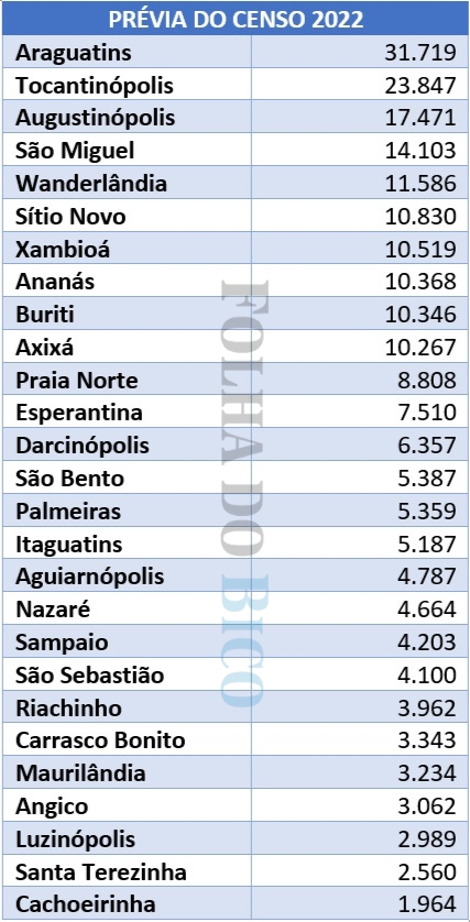 Araguatins, Tocantinópolis e Augustinópolis continuam sendo os mais populoso do Bico do Papagaio. cachoeirinha, Santa Terezinha e Luzinópolis, os menores.