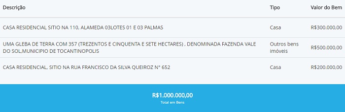 Já em Augustinópolis a ex-prefeita Carmem, declarou a Justiça possuir R$ 2.221.000,00, em patrimônio e Professor Júlio R$ 276.000,00.