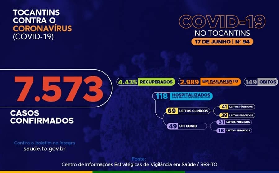 Desta forma, hoje o Tocantins contabiliza 7.573 casos confirmados da doença, destes 4.435 pacientes estão recuperados e 2.989 estão ainda em isolamento domiciliar ou hospitalar, além de 149 óbitos.