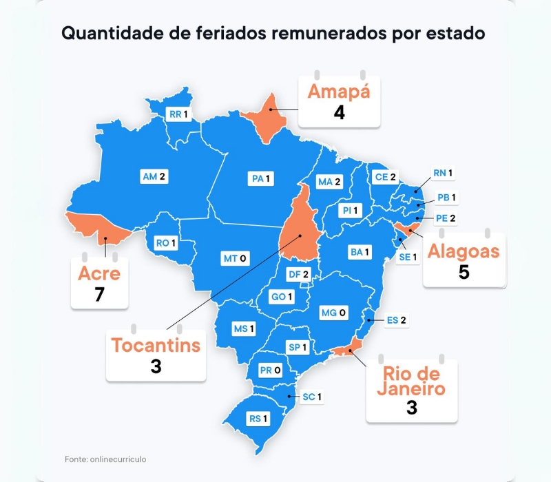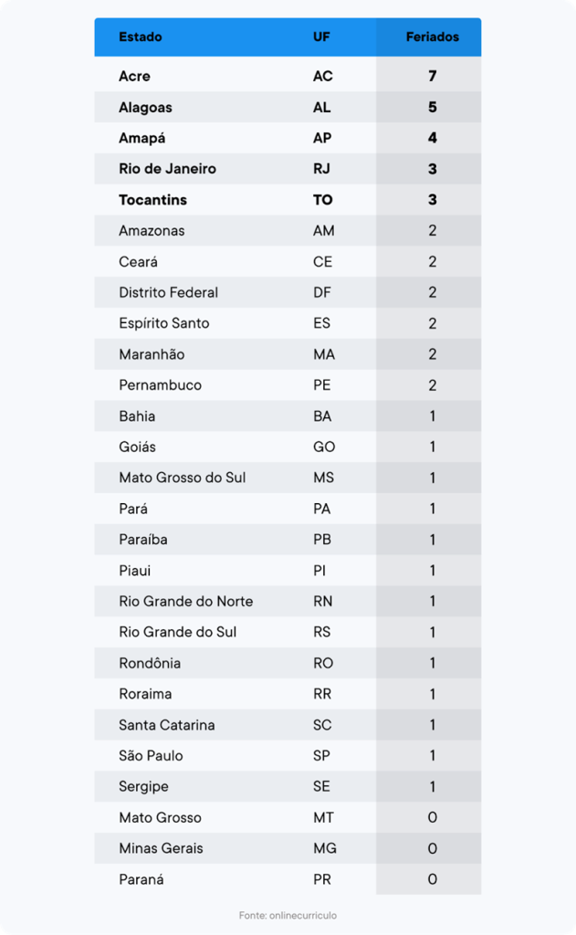 No entanto, inegavelmente, feriados são datas importantes para o descanso dos trabalhadores, que muitas vezes anseiam pelas datas para conseguirem recobrar as energias ou poder fazer alguma programação diferenciada, que ganha ainda mais expectativa quando se formam os conhecidos feriadões. Neste sentido, a Onlinecurriculo, plataforma de currículos online, realizou um levantamento mapeando quais são os estados brasileiros que possuem mais feriados remunerados e quais trabalhadores do Brasil, por consequência, possuem mais dias de folga ao longo do ano.