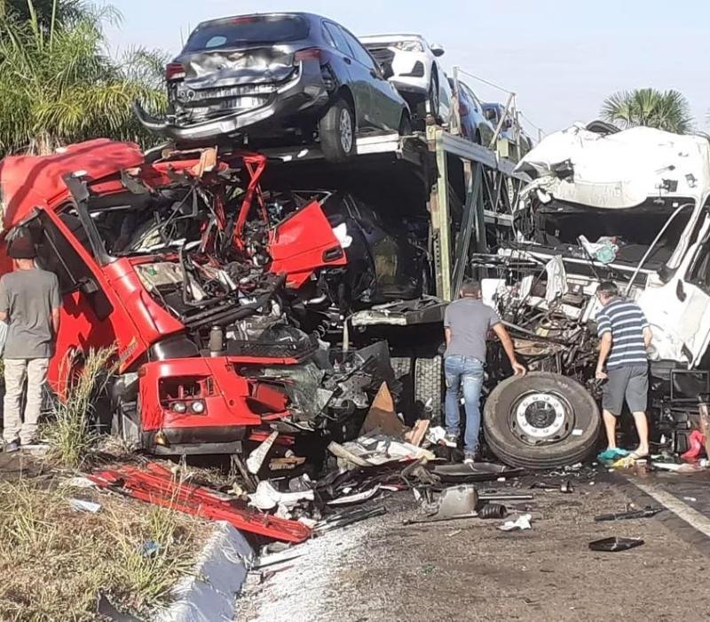 O acidente aconteceu na manhã deste domingo (28). Com a força do impacto, alguns veículos que eram transportados nas carretas também foram danificados.