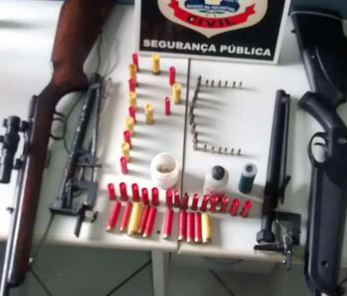 A Polícia Civil do Tocantins, por intermédio da Delegacia de Xambioá, apreendeu nesta quarta-feira, 2, três espingardas, bem como munições de calibre 22 que estavam em poder de dois indivíduos em uma propriedade rural daquele município. Na ocasião, os suspeitos de iniciais E.M.S, de 37 anos de idade E.P.S, de 44 anos foram presos e autuados em flagrante pelos crime de posse ilegal de arma de fogo.