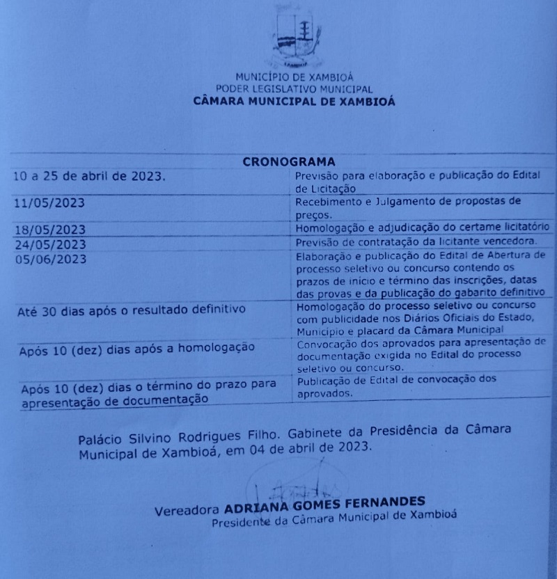 A mesa diretora da Câmara de Xambioá apresentou o cronograma para o concurso público, com a data de até esta quinta, 11, para apresentação de propostas de empresas interessadas em realizar o certame.