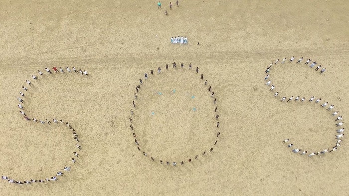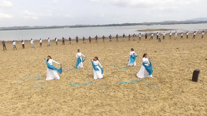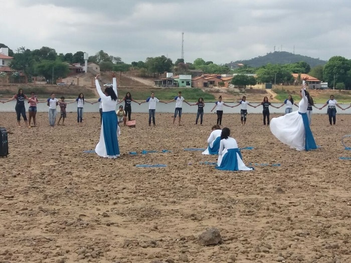 De mãos dadas os participantes fizeram o símbolo SOS, que é usado mundialmente como pedido de socorro. Eles se posicionaram em meio ao rio e cantaram de mãos dadas a música ‘Planeta água’ que fala sobre a importância da água para a vida na Terra.
