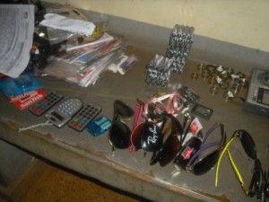 A abordagem foi feita após a PM ser acionada via 190 e no endereço citado o solicitante informou que ao chegar ao box da feira coberta onde trabalha percebeu que o cadeado estava serrado. Com a ajuda de testemunhas a polícia localizou os autores e os produtos furtados, que são: 30 fones de ouvido, 18 carregadores de celular, 01calculadora grande, 36-dvds, 02 controles de caixa de som, 03 adaptadores de cartão, 01 cabo de dvd, 03 pen drivs, 01 lanterna pequena sem marca, 02 chupa cabras, 01 mini game, 01 carteira de bolso, 02 calculadoras, 02 tocas para celular, 15 óculos de sol, 01 celular de brinquedo, 56 pilhas maxfera para controle remoto, 01 rádio pequeno, 01 espelho pequeno, 60 anéis de aço, 01 cadeado com chave, 03 relógios sem marca, 03 bonés, 03 chapeus de pano e 01 mochila de pano.