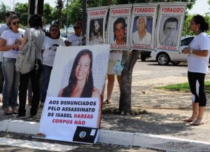 Cerca de vinte pessoas vestidas com camisas com fotos de Isabel e com cartazes com fotos dos denunciados pelo Ministério Público, reivindicam que o TJ não conceda o habeas corpus aos três foragidos.