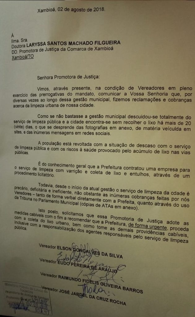 Nesta quinta-feira, 2, um grupo de vereadores de Xambioá, na região do Bico do Papagaio, foi ao Ministério Público, denunciar os problemas da falta de coleta de lixo que já perdura por mais de 20 dias.